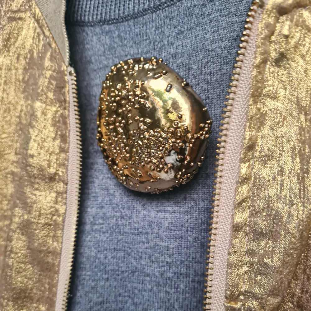 Image Vigna-Sasso-dore-8091.jpg Image Vigna-Sasso-8091-ON-NET.jpg Back to list Brooch Sasso #8091 Giorgio Vigna Materials Gilded copper and silver granules, and a magnet Edition Unique, 2025 I am interested