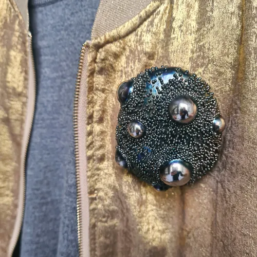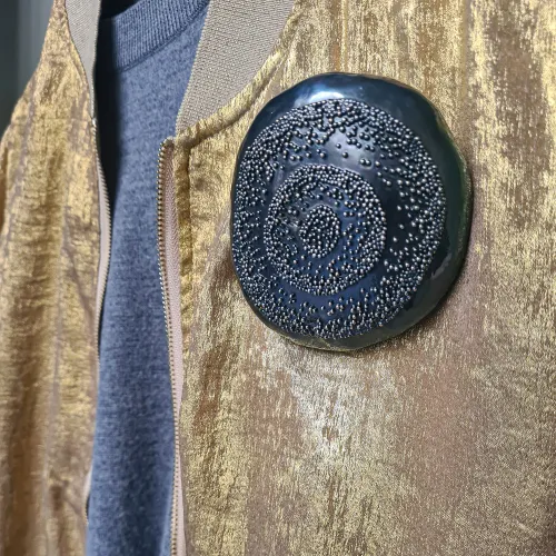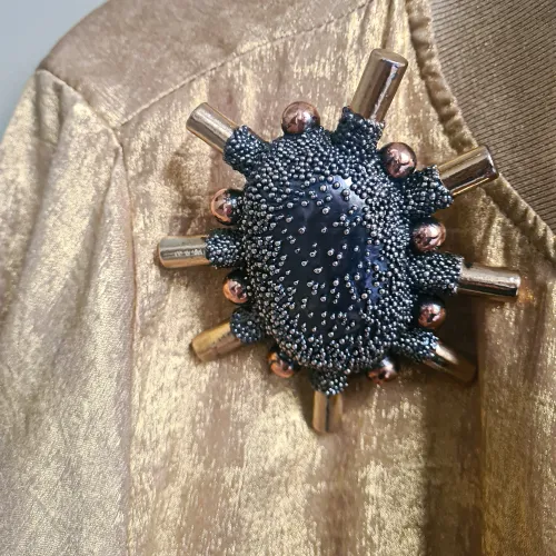9 reversible pebbels in gold-plated, silver-plated, and partially oxidized copper, with silver granulation and a magnetic clasp